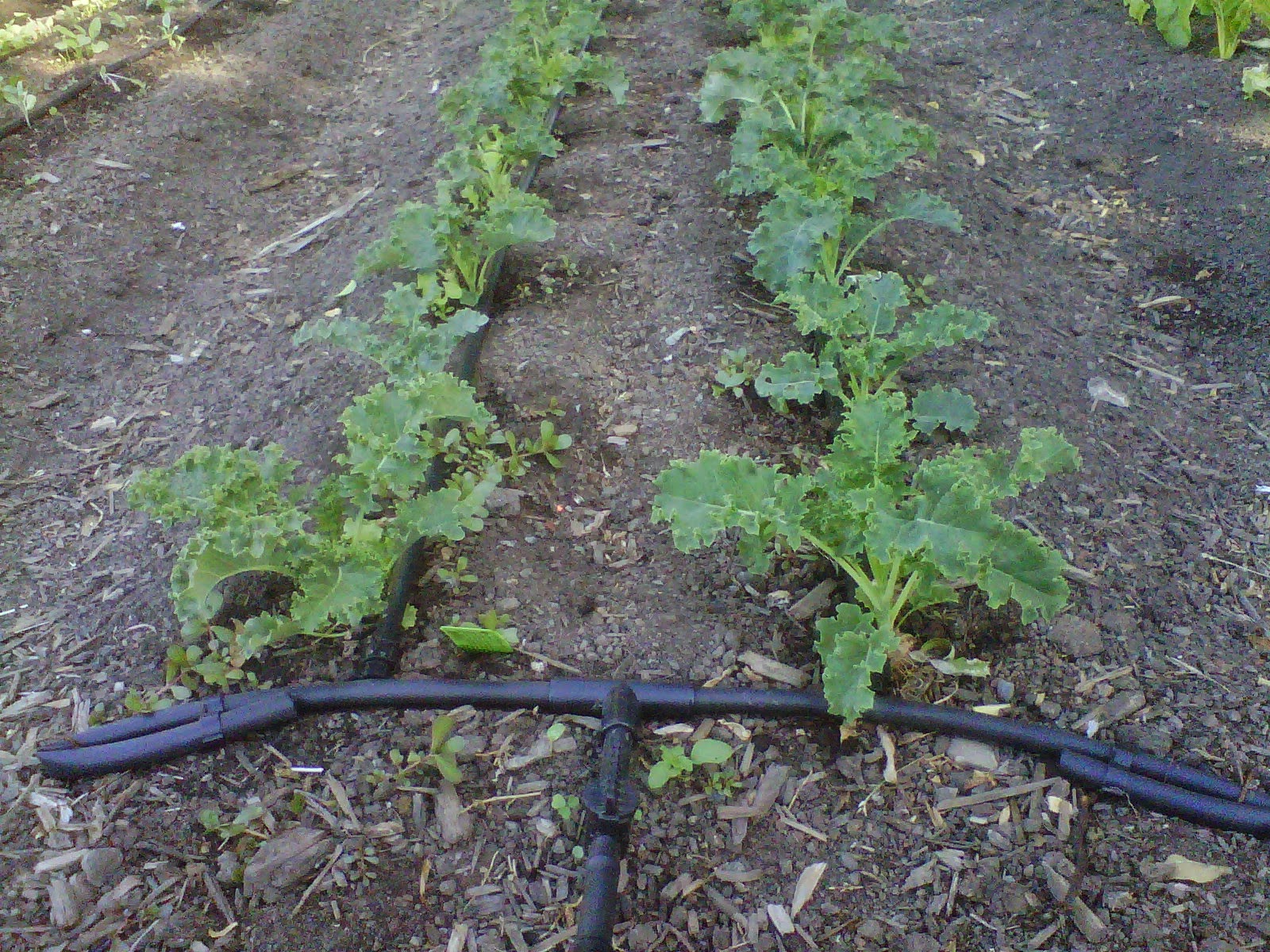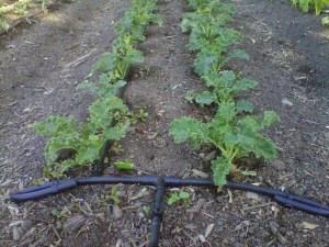 1/2″ line comes up at the edge of the bed from a “T” fitting 4 or 5 inches below ground. A 5 inch piece of 1/2″ line comes out from the “T”, going into an elbow fitting. Out of the elbow fitting is a short piece of poly line that goes into the valve shown. The barbed valve connects into a “T” that the drip actually connects into. To make this system more flexible, a female hose coupling should have been added after the valve, that way you can swap out the drip tubing for an overhead micro sprinkler system using male threaded couplings (the kind used to cap off ends)
