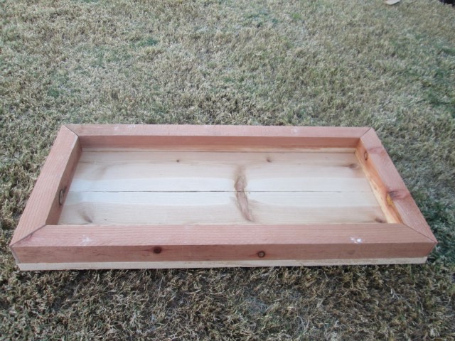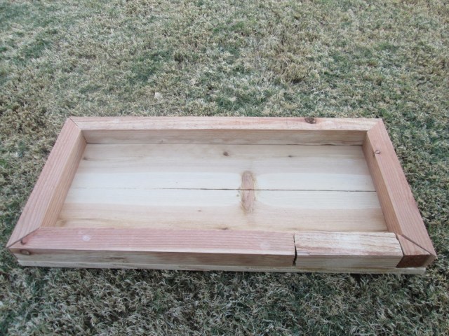 Redwood rough board is listed as 2″x 2″, but is actually only about an inch and a half. This gives us a surface area of 20″x 8″ within the frame to put our soil blocks (subtracting the width of the trim pieces from all sides).