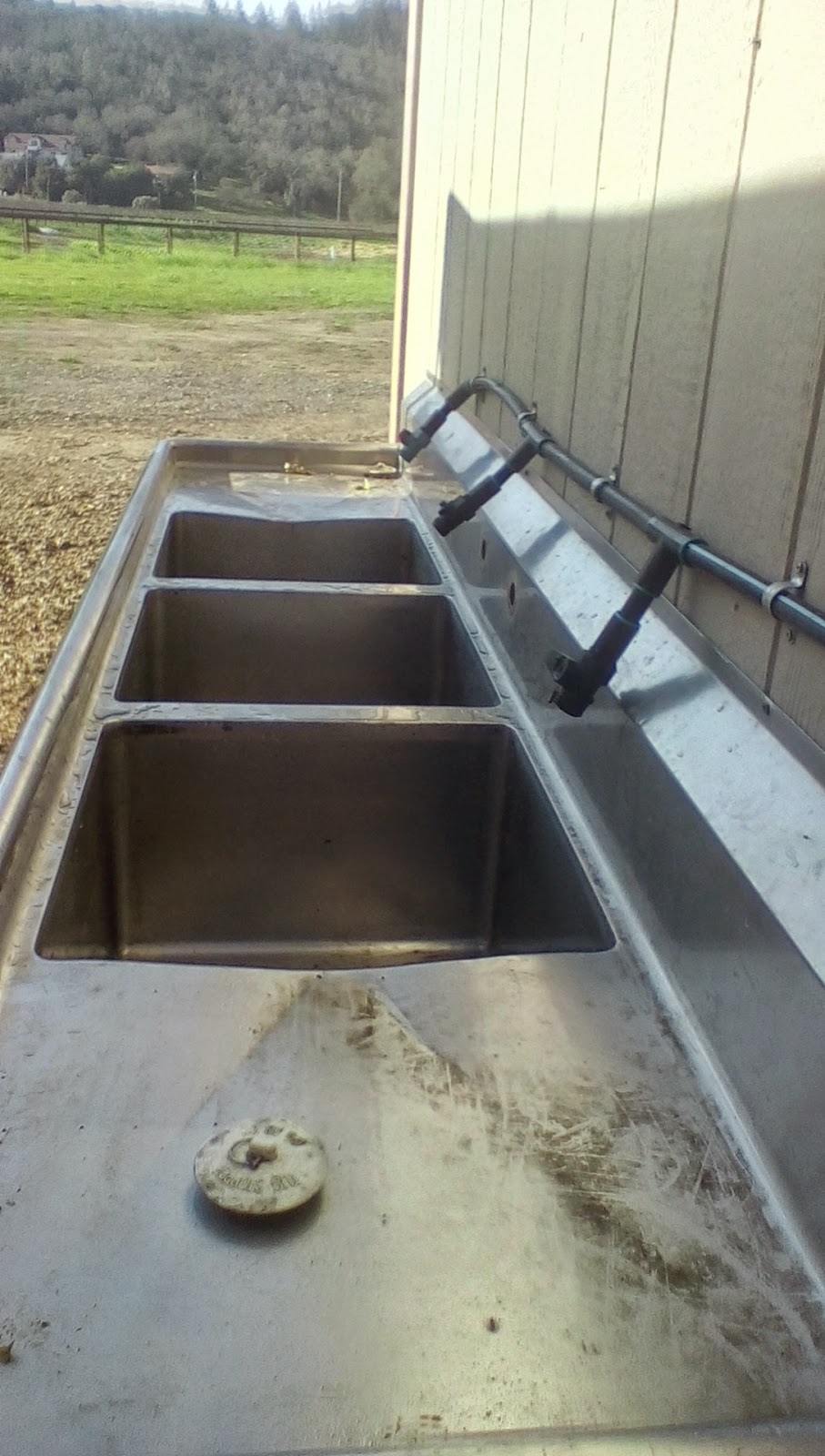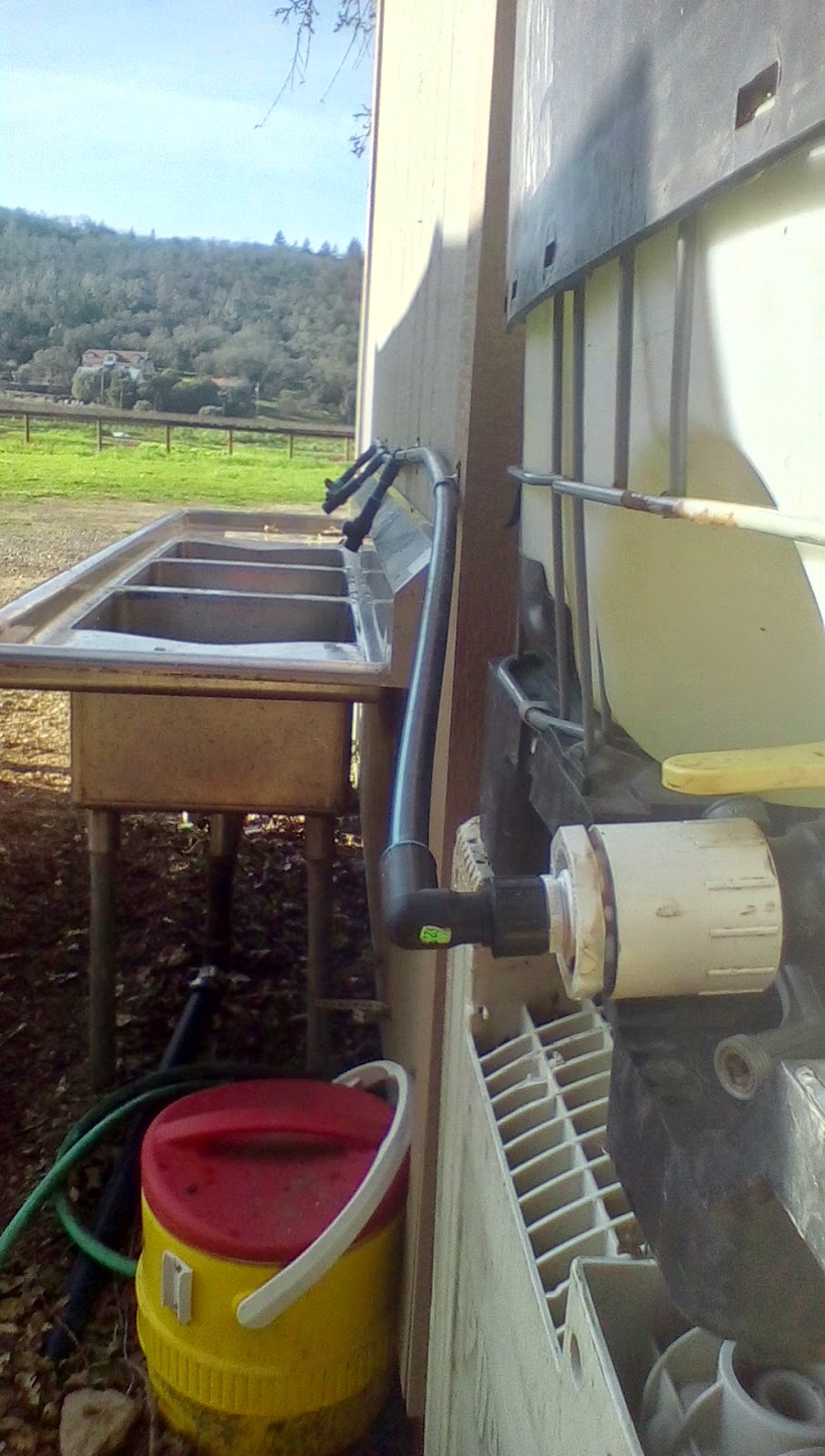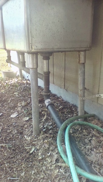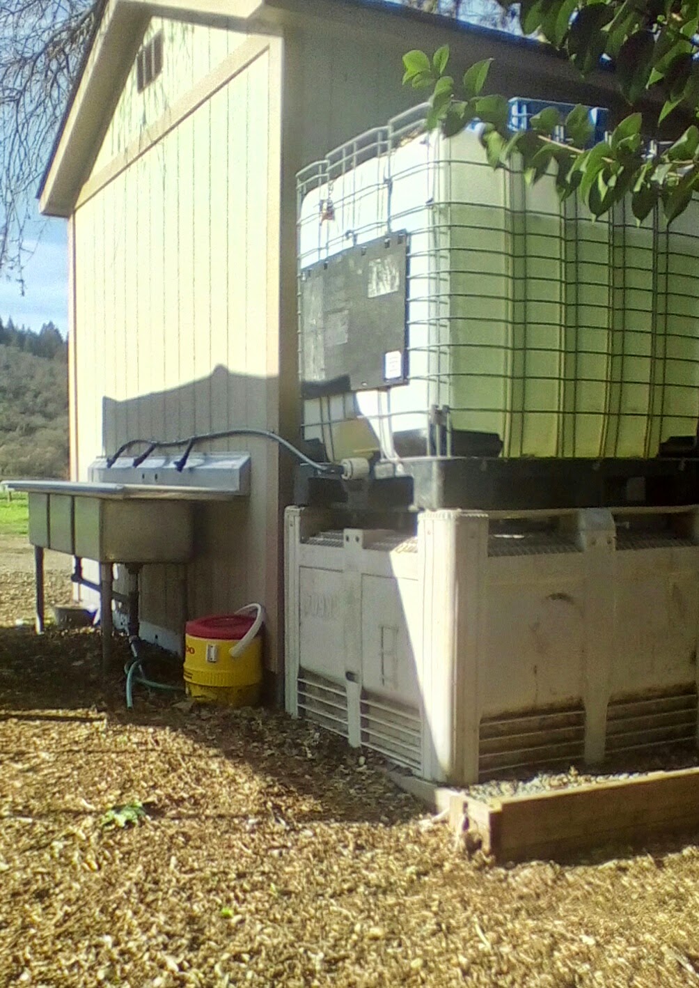 Water to wash produce is across a small street, so filling the square tote above with water periodically seems like a decent work-around. It always seem a huge hassle to try and adapt old sinks into wash stations. I bypassed the whole adaption process and just decided to get rid of the top plumbing. The plumbing is mostly polytubing, with single adapter of some kind to take it from pvc to hose thread. All those spigots have simple shut off valves. Future improvements could include putting in rain-water catchment system tie-in and maybe pressurizing the system with a solar powered pump. Sink drains into a swale behind the processing area.