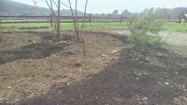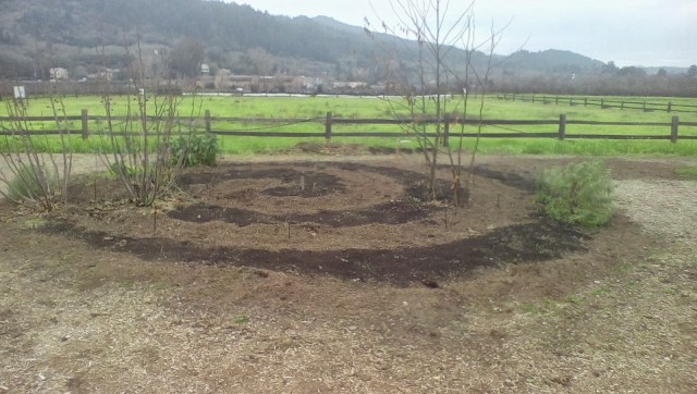 The spiral garden pictured here is actually one swale and berm curled up on itself. Some of the inspiration has come via Gaia’s Garden and similar designs at Bayer Farm. The swale has a polytubing micro sprinkler setup buried underneath the wood chips. The berm was broad forked and raked, seeded to cover crop, and dusted with compost to bury the seeds.