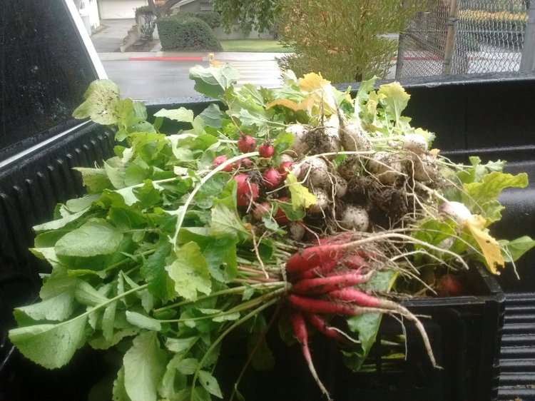 Harvested a little bit of beets, Radishes, fava bean greens, and baby turnips in the rain. A little wet here in soCal, but not too bad.